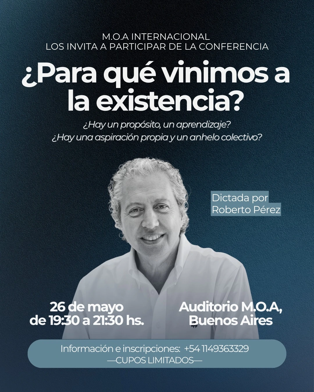 M.O.A Internacional te invita a participar de la conferencia dictada por Roberto Pérez, un espacio de reflexión profunda para explorar el sentido de nuestra presencia en el mundo y el llamado interior que nos habita.